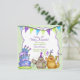 Cute, funny neutral birthday party invitation features a pair of cats in party hats with drinks and noise maker. Fun crooked layered birthday cake with candles and bunting banner. Main colours are green and purple. Text on front and back of this fun card is ready for you to customise with your party information. Card back has matching design.