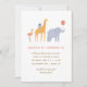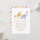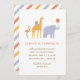 Calling all party animals! Celebrate your little one's birthday with this colourful invitation, featuring a party-going flamingo, giraffe and elephant and a bold stripe pattern on the back.