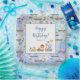 Add a special touch to your little boy or girl's big day with this custom jungle-themed birthday party paper plate. There is a lion with a top hat, a giraffe with a bow tie, and an elephant with a party hat and balloons. All safari animals are painted in watercolor and are sitting on a train. There is also a train, rainbow, star, sun, and cloud pattern on blue. Text may be modified per your needs. Right now it says "Happy Birthday" and is followed by the kid name and age.