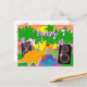 Party DJ Dinosaur Postcard. A cool cartoon DJ dinosaur Diplodocus wearing sunglasses playing music at a groovy party on a tropical location with palm trees and a big yellow sun at sunset with customisable text "Party!". This cool happy birthday/ party postcard is fully customisable, add your texts and image(s). A colourful party cartoon animal postcard for the big and/ or little dinosaur fans!