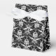 Party favour box shown in a black and white damask pattern design.