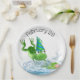 Cute green frog leaping into water with a birthday party hat and February 29 text for leap year birthday.
