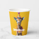 A charming baby giraffe dressed up for a celebration, wearing a festive party hat with colourful patterns and fluffy decorations. The giraffe sports a fluffy, multicolored feather boa and stands against a bright yellow background, creating a joyful and whimsical scene.