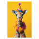 A charming baby giraffe dressed up for a celebration, wearing a festive party hat with colourful patterns and fluffy decorations. The giraffe sports a fluffy, multicolored feather boa and stands against a bright yellow background, creating a joyful and whimsical scene.