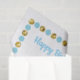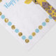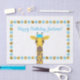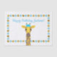 Illustration of a cute Giraffe wearing a party hat with a blue and gold dotted border and custom text area.