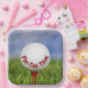 Close up of a white golf ball on a red tee in the grass with a sky background.