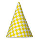 This party hat is shown with a fun yellow color checkered print.