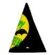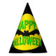 It's interesting to note that bats became associated with Halloween because of big bonfires that were lit to celebrate. The bonfires attracted all manner of flying insects to the party, which created a feeding frenzy from the bats that cashed in on the bounty. They were actually providing a public service. As the discovery of vampire bats was made and the legends of Count Dracula became more renown, it seemed obvious that the two would end up connected and connected to this holiday of ghosts, ghouls and goblins. It's an iconic Halloween image, a black bat on a yellow moon. For this design, it is overlaid with text in a slimy, oozy, drippy toxic green font, which reads "Happy Halloween". The font has been dimensionalized for even greater interest, the shadows accentuating the black of the bat. This delightful design is offered on these fun and fabulous party hats that can add to your Halloween couture or decor.
