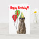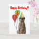 A funny Meerkat birthday card featuring a Meerkat holding balloons