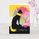 PAWTY. Party Invitation with a feline cat theme. Paper greeting card with a black cat wearing a bright yellow scarf and sitting in front of a painterly background. Bright and colourful feline themed design. Add your party information inside before checkout. Art, image, and verse copyright © Shoaff Ballanger Studios, 2022.