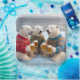 Three happy polar bears are partying on an Arctic glacier, wearing Christmas ugly sweaters and holding mugs of beer