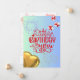 Front: The card has a light blue background. In the centre, there is a large red text that reads “Happy Birthday to You,” decorated with white and red stars. Above the text, there are two white fireworks, and scattered around are small stars. To the right, there are two gift boxes with red ribbons, and in the bottom left corner, there is a golden heart-shaped balloon.