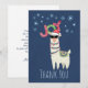 A Christmas thank you card for a party or gift appreciation. Designed with a funny illustration. A cute llama wearing black sunglasses and a red santa hat. Also wearing a South American styled blanket and pom-poms. The word Joy written above his head in a festive colourful font. Blue snowflakes falling down.