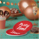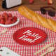 "Party Time" written in a brush lettering on a red sunburst background.