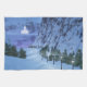 A 3D fantasy landscape full of shimmering snow and magical fairy lights. A row of silvery shining lamps lights the trail through a snowy mountain pass hemmed in by steep rocky cliffs. The sparkling snow-covered path is hemmed in by dark fir trees. On the far side of the cleft a translucent glowing fairy castle awaits the enchanted traveller on his journey to fairyland.