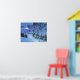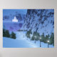 A 3D fantasy landscape full of shimmering snow and magical fairy lights. A row of silvery shining lamps lights the trail through a snowy mountain pass hemmed in by steep rocky cliffs. The sparkling snow-covered path is hemmed in by dark fir trees. On the far side of the cleft a translucent glowing fairy castle awaits the enchanted traveller on his journey to fairyland.