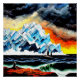 A.I. assisted print of the sky filled with dramatic clouds and a colourful sunset as a sailboat glides across agitated waters while passing a towering iceberg in the background.