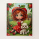 Enjoy your time with this charming puzzle that combines beauty and entertainment! The image features a cute girl with curly red hair wearing an apple-inspired outfit, including an adorable apple-shaped hat, sitting next to a lovely little puppy. The scene is set in a beautiful orchard filled with apple trees, with a cosy countryside house in the background. Perfect for both kids and adults, this puzzle offers a fun challenge while stimulating creativity and patience. Made with high-quality, durable pieces that are easy to assemble, making it a great gift for puzzle lovers and fans of delightful illustrations.