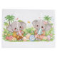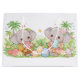 This adorable pastel illustration features two cute baby elephants holding beautifully decorated Easter eggs, surrounded by flowers, butterflies, and tropical greenery.