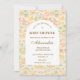 A whimsical watercolor design featuring a playful mix of pastel summer animals surrounded by tropical leaves, seashells, starfish, and soft botanical details. The cheerful palette of peach, mint, coral, and soft blue creates a light storybook atmosphere, while the elegant arch layout keeps the celebration details beautifully framed and easy to read. Perfect for a warm, joyful summer celebration with a charming nursery aesthetic.