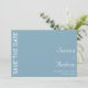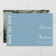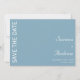 Pastel blue plain minimalist front side with chic script and photo reverse side personalised save the date invitation. This card is easily editable. If you need help with the customisation of this product or you need more matching products for this collection kindly message me via Zazzle.