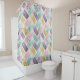 A lively abstract shower curtain featuring broad, textured brushstrokes in pastel pink, purple, teal, and soft white, intersected by thin, shimmering gold lines that form a woven, diagonal crisscross effect. Playful black and white speckles dot select sections, adding depth and contrast. This vibrant, modern pattern blends elegance with artistic flair—ideal for creative, colourful aesthetics with a hint of glamour.