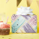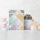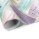 A lively abstract wrapping paper featuring broad, textured brushstrokes in pastel pink, purple, teal, and soft white, intersected by thin, shimmering gold lines that form a woven, diagonal crisscross effect. Playful black and white speckles dot select sections, adding depth and contrast. This vibrant, modern pattern blends elegance with artistic flair—ideal for creative, colourful aesthetics with a hint of glamour.