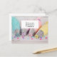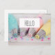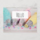 A hello postcard with a pretty pastel coloured photograph. Featuring cake decorating items in pastel blue, pink, peach and yellow. Set upon a wood table with little colourful beads. A white rectangle with a pink border layered over top with hello written inside.