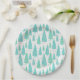 A winter pattern of illustrated pastel blue and green Christmas trees arranged into a never ending forest of festive trees. They are decorated with garland and stars.
