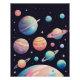 In the vast expanse of dark space, planets in soft pastel hues float like ethereal gems, their delicate colours contrasting vividly against the inky backdrop. Each planet glows with a gentle radiance, casting a serene and otherworldly light across the cosmos.