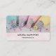 Business cards with a pretty pastel coloured photograph. Featuring cake decorating items in pastel blue, pink, peach and yellow. Set upon a wood table with little colourful beads.