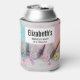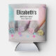 Birthday can cooler with a pretty pastel coloured photograph. Featuring cake decorating items in pastel blue, pink, peach and yellow. Set upon a wood table with little colourful beads. A white rectangle with a pink border layered over top with your personalised text inside.