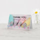 Thank you greeting card with a pretty pastel coloured photograph. Featuring cake decorating items in pastel blue, pink, peach and yellow. Set upon a wood table with little colourful beads.