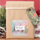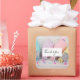 Thank you stickers with a pretty pastel coloured photograph. Featuring cake decorating items in pastel blue, pink, peach and yellow. Set upon a wood table with little colourful beads. A white rectangle with a pink border layered over top with thank you written inside.