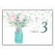 A whimsical blue green mason jar holds pale pink and white flowers with soft teal greenery on this wedding table number card. A background of pastel pink and blue confetti combines with gold flecks to add interest and contrast to the delicate flowers. Your custom text is in darker teal. The back of the card is identical to the front. Be sure to see the matching wedding invitations in our store. *This design uses artwork from LABFcreations on Etsy.
