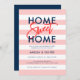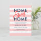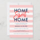 Stylish Housewarming Party invitation featuring the words "Home Sweet Home" in blue sans serif and orange trendy script all against a pastel coral pink and white stripes background. Card has a blue colour back side. Check out other new home items here https://www.zazzle.com/rosewoodandcitrus/new%20home?rf=238364477188679314