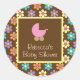 This round baby shower sticker features pastel daisies on a chocolate brown background. In centre centre of the sticker is a brown square with customisable text and a pink baby carriage.
