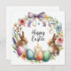 This image presents an elegant Easter wreath design. At the centre is the phrase "Happy Easter" written in a graceful font. Encircling the text is a decorative wreath made up of various festive elements, including:
