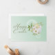 Easter holiday greeting card featuring a watercolor illustration of a white daisies and white and yellow florals combined with white and cream Easter eggs and holiday greenery set on a watercolor green background. Bold script "Happy Easter" to the left of illustration. A smaller version of the illustration is repeated on the back of card in the bottom right with room for a personal handwritten note. Additional sizes available.
