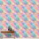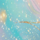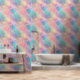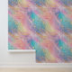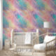 This wallpaper features swirls of pastel colours in shades of pink turquoise, orange and yellow, with heavenly golden accents.