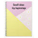 Brighten your day and spark creativity with this pastel-themed spiral notebook! Featuring a soft pink and yellow geometric design, accented with delicate daisies, and a customisable motivational quote: "Small ideas, big beginnings". Personalise the text to make it uniquely yours—whether for journalling, note-taking, or gifting.