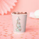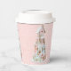 This paper cup design features a trendy pastel gingerbread cookie castle made with 4 layers of cookie houses. Colours include light pink, light blue and light green and tan on a pink background with a white snowflake pattern.