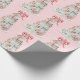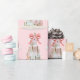 This gift wrap design features a trendy pastel gingerbread cookie castle made with 4 layers of cookie houses with a bow on top. Colours include light pink, light blue and light green and tan on a light pink background.