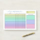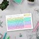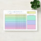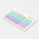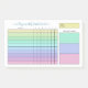 Weekly habit tracker post-its with charts filled in with pastel colours ranging from yellow to green to purple to pink. Add your name in a blue script. The habit tracker notepad features a handy chart where you can check off each day of the week with up to ten habits. Add the time period by hand. And jot down three weekly goals too! All categories are customisable in case you want to change the wording or even the purpose of the planner.