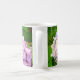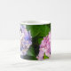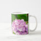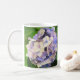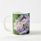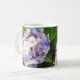 A photograph of blue and purple hydrangeas on a coffee mug.