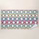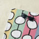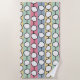 This beach towel has a mid-century modern design of white “deformed” circles connected with black lines on a field of pale green, pale pink, pale blue, and pale yellow strips. If you like the design but prefer different colours, message me.