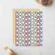 This flat, blank note card has a mid-century modern design of white “deformed” circles connected with black lines on a field of pale green, pale pink, pale blue, and pale yellow strips. Add your own personal message on the back. If you like the design but prefer different colours, message me.