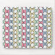 This mouse pad has a mid-century modern design of white “deformed” circles connected with black lines on a field of pale green, pale pink, pale blue, and pale yellow strips. If you like the design but prefer different colours, message me.
