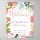 Spring wildflowers bridal shower welcome sign poster template with a pretty hand-drawn floral wreath in shades of coral red, ocean blue, fern and sage green, bright yellow and blush pink with blooms and foliage and with a chic modern contemporary changeable elegant typography script text. +++++++++ The sign is ideal for country rustic spring or summer | floral garden | elegant outdoor or backyard wedding shower receptions.