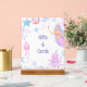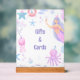 In the centre, the bold text "gifts and cards" ensures your guests easily know where to place their presents 🎁. The soft pastel colour palette of pinks, purples, and blues creates an elegant and modern look, perfect for a girl’s first birthday under the sea theme 💖🌈. The combination of watercolor illustrations and playful sea creatures makes this sign a standout decorative piece for your party table, complementing ocean birthday decor, sea life birthday themes, and whimsical Little Mermaid celebrations.